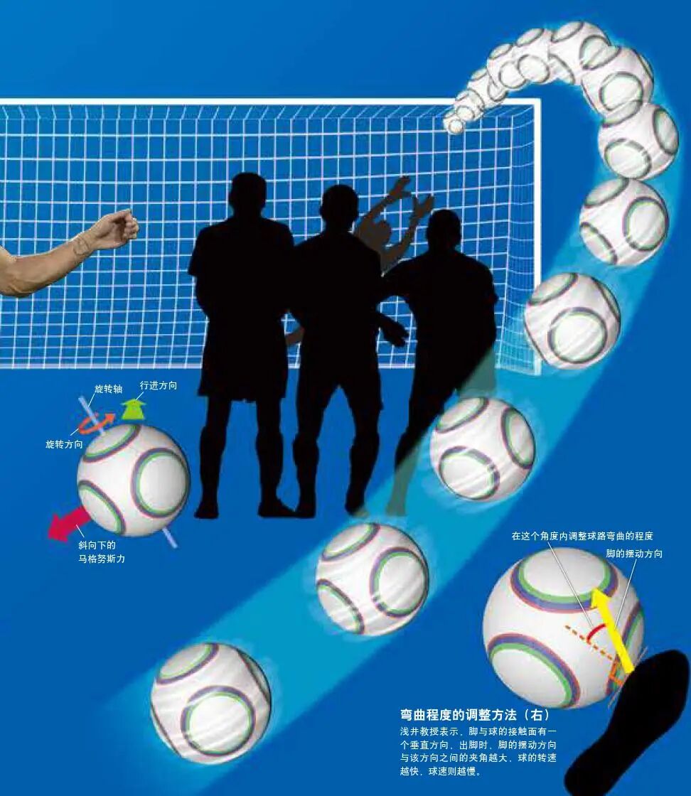 踢出弧线的关键在于,落脚点在偏离球心的位置,偏离球心的幅度越大,球的转速越快。而且,浅井教授表示,球与脚的接触面有一个垂直方向,要想踢出理想的香蕉球,脚的摆动方向与该垂直方向之间的夹角需要在35°左右。该角度越大,球的转速越快,球速就越慢。