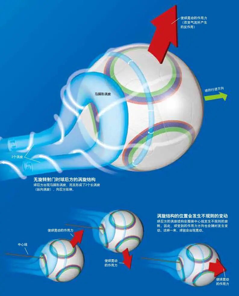 这种涡旋结构会使球后方的气流偏向一侧,因此,球会受到其反作用力。而且,这种涡旋结构会发生不规则的旋转,所以其反作用力的方向也会随之发生不规则的变化,从而导致球的晃动。无旋转射门时,球速越快,气流的作用力越大,球晃动得越厉害。