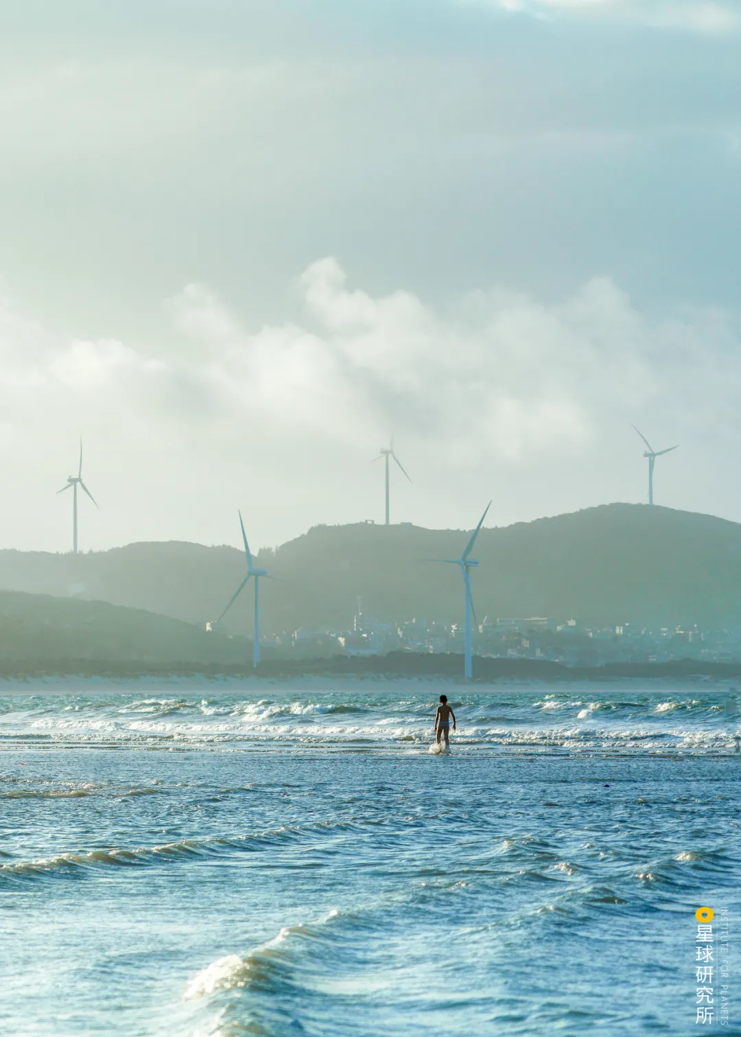 (平潭长江澳海滩和远处的风力发电机组,摄影师@李华刚)