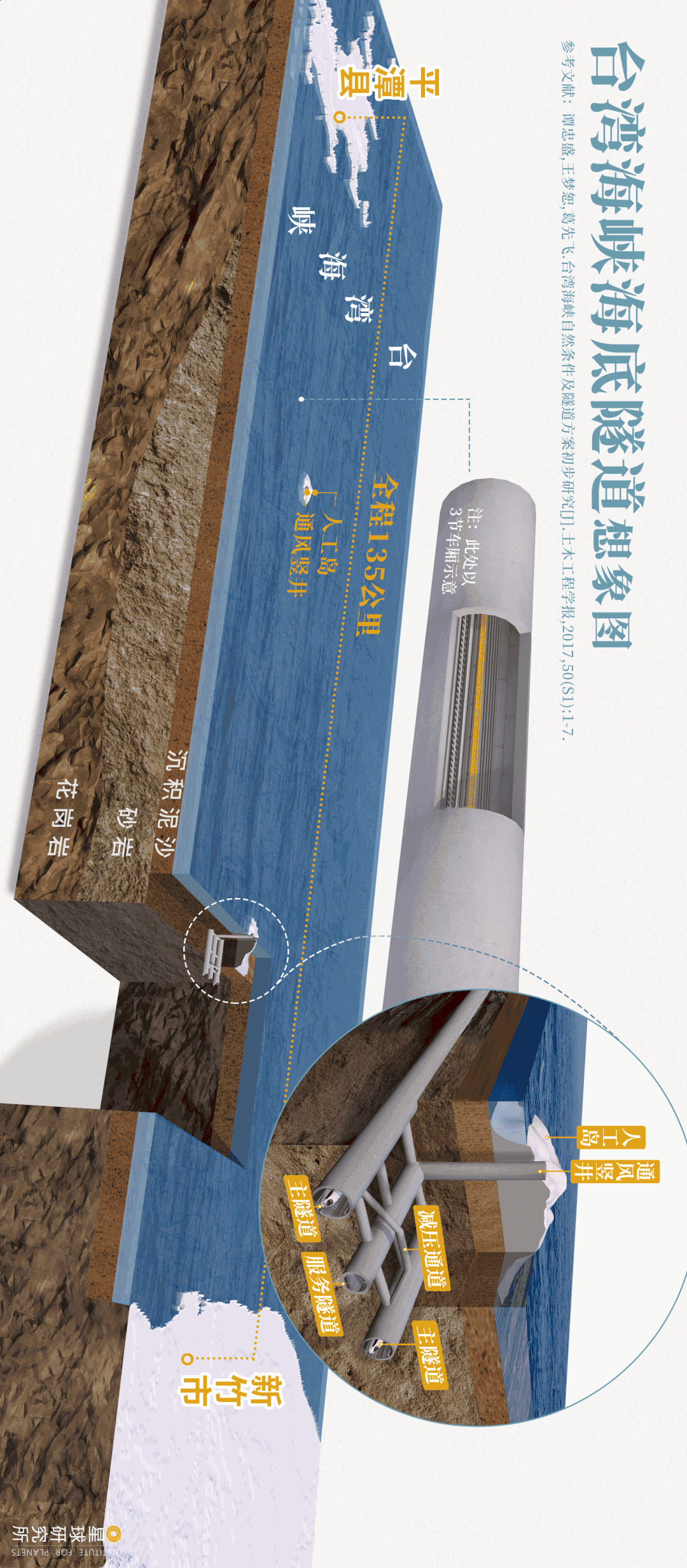 (请横屏观看,台湾海峡海底隧道施工想象图,海底隧道实际上有北线、中线、南线的3至4个方案,其中经过平潭的北线方案,距离最短,海底地质条件最适合隧道建设,此想象图采用双洞单线+服务隧道的方案,每隔一段距离设置有一个通风竖井通向海面人工岛,减压通道则是为了减轻列车运行引起的空气动力学效应而设置,制图@杨宁&陈志浩/星球研究所)