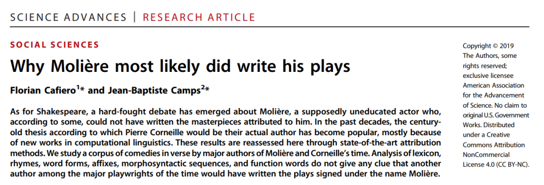 2019年,两位法国学者在学术期刊《科学进展》 (Science Advances)上发表了一篇论文,题为“Why Molière most likely did write his plays(为什么说莫里哀很可能写了他的剧本)”。
