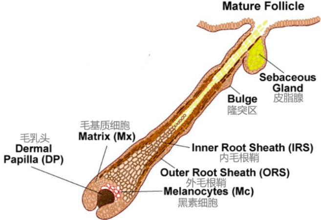 毛发的生长与毛囊干细胞(HFSCs)息息相关。毛囊干细胞位于毛囊一个叫做隆突区(Bulge)的区域,这些干细胞受到内部或外部信号的指导调控着毛发的生长。在休止期,毛囊干细胞处于休眠状态,不会分裂;当进入生长期时,毛囊干细胞被激活,启动短暂增殖,生成新的毛发。