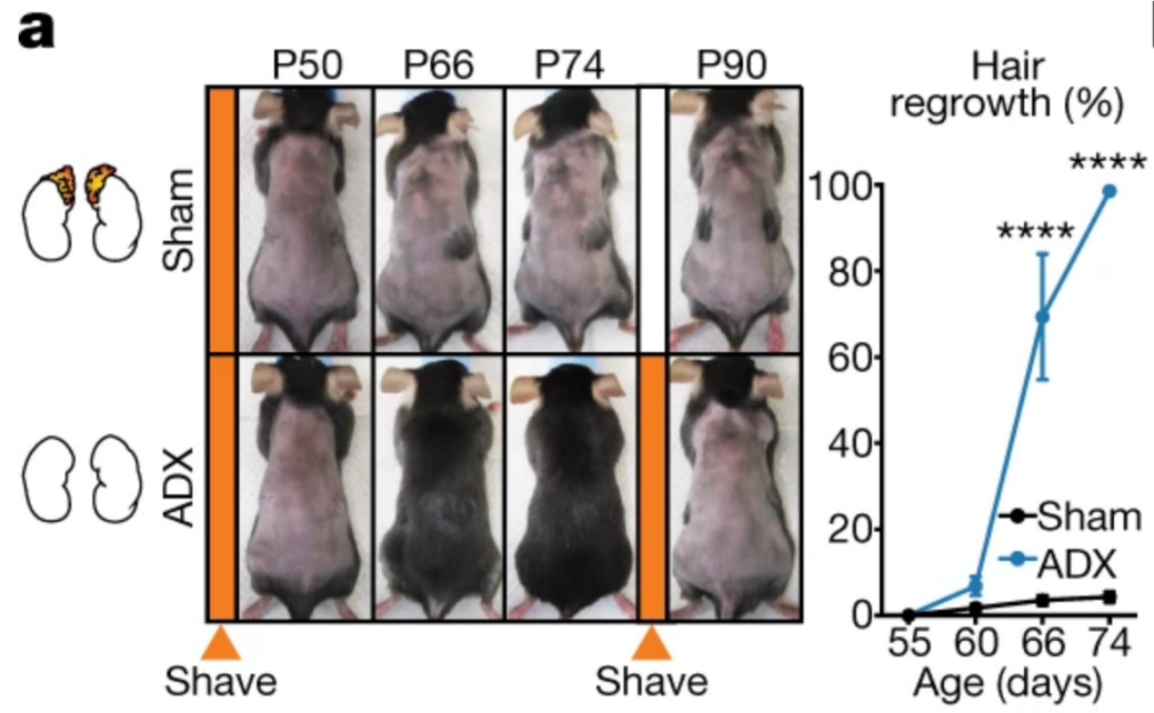 为了确定压力激素如何影响毛发周期,研究人员对小鼠进行了肾上腺切除术(ADX)来探讨对毛发生长的影响。