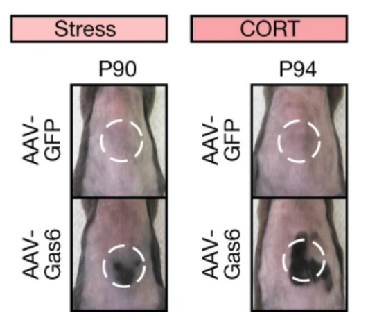 一个好消息是,小鼠中压力诱导的脱发是可逆的。既然GAS6是激活毛囊干细胞的“令箭”,科学家就将这一“令箭”输送到小鼠皮肤中。输送GAS6不仅刺激了正常小鼠的毛发生长,而且使得处于长期压力或皮质酮喂食下的小鼠恢复了毛发生长。