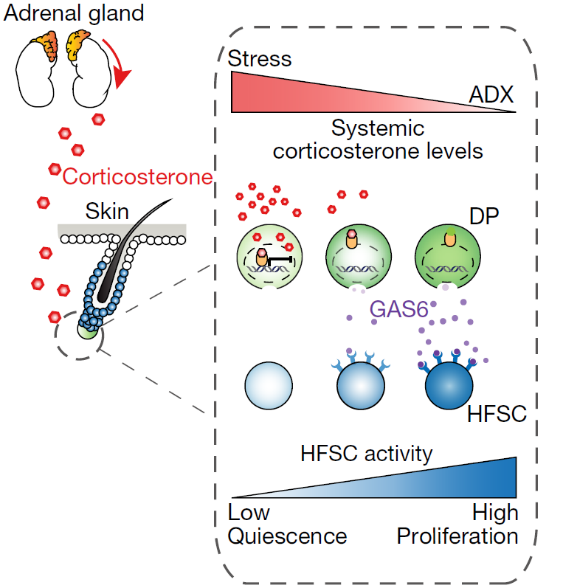 原来,皮质酮——这个代表压力的信号分子真正靶向的是毛囊中的真皮乳头(DP),即毛乳头。毛乳头是毛囊下方中的一簇真皮细胞,它像司令一样审时度势,根据所处的外部环境对毛囊干细胞下 “命令”,而这“令箭”就是生长停滞特异性蛋白6(GAS6)。GAS6能激活毛囊干细胞,促进其增殖。