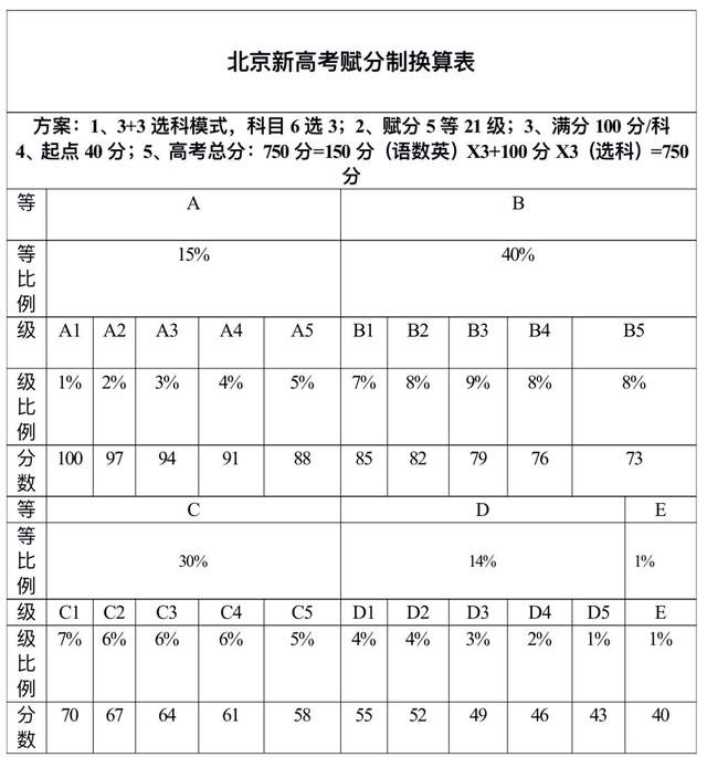 但是省区的赋分规则也有些差异,比如北京市的赋分方案采取的是“5等21级”的等级折算办法,等级性考试成绩由高到低分为A、B、C、D、E共5等,其中A等占考生比例的15%,B等占40%,C等占30%,D等占14%,E等不超过1%。在计入高校招生录取总成绩时,等级性考试成绩每科成绩由5等细化为21级。