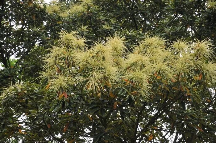 作为一种菌根菌,致命鹅膏喜欢生长在黧蒴栲(跟我念:lí shuò kǎo)Castanopsis fissa林中。这种植物是壳斗科锥属的,高可达10几米,在我国主要分布于华南、西南地区。每年黧蒴栲开花的时候,我们就有可能在树底的土地上发现致命鹅膏的身影,目前还未见该种生长在其它林子内的报道。
