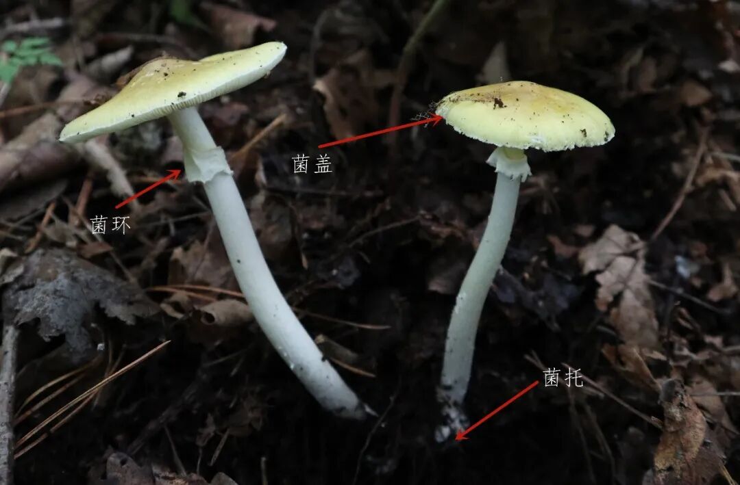 看看下图,头上带帽(菌盖),腰间系裙(菌环),脚上穿靴(菌托),这样的蘑菇就是鹅膏属的了,遇到了千万不要采!请勿轻信民间的鉴别方法!不要在作死的边缘试探!