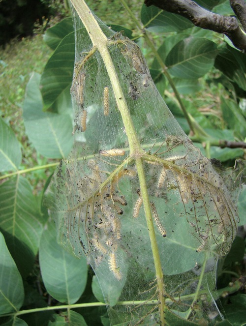 天幕毛虫又名秋幕毛虫、网幕毛虫、美国白蛾等,是很知名的世界性检疫害虫,也是大名鼎鼎的外来有害生物。在天幕毛虫爆发的季节,法桐、臭椿、国槐、白蜡等多种园林植物的树冠上都挂满了网幕,这些网幕就是天幕毛虫幼虫为自己建造的房子。它们不是单独作战,而是一群幼虫共同吐丝,围绕着一定数量的树叶和树枝建成一个可以容纳它们的大型丝状网幕。这些幼虫躲在网幕里大快朵颐,将叶片蚕食得只留下网状叶脉。有的树冠已经光秃,发生严重时可将整株树叶吃光,造成部分枝条甚至整株植物死亡。天幕毛虫幼虫有6~7个龄期,1~4龄幼虫具有结网的习性。l~2龄幼虫因为个体较小,所以只吃叶肉而留下叶脉,使得叶片呈透明纱网状。3龄以后幼虫会将叶片咬成缺刻,再大一些就可以将整个叶片吃光。3龄前的幼虫群集在一个网幕内生活,而随着身体的长大,到了4龄,一个网幕已经不能容纳那么多的个体了,所以4龄开始幼虫便分成若干个小群体,织成多个网幕。如果网幕内的叶片被吃光,它们就会移至另外一个地方织一新网。