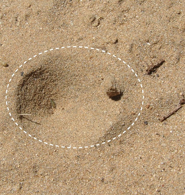 蚁狮是脉翅目蚁蛉的幼虫,长相凶狠,头上有一对尖利的大颚。蚁狮喜欢在干燥的沙土地上挖坑,通常沙的含水量小于2%。蚁狮用尾部向下拱,使身体退入沙中,只留头上的一对大颚露在外面,然后不停地用大颚将沙粒向四处弹出,使沙坑的口儿一点点扩大,最后形成一个漏斗形的陷阱。漏斗的坡度非常重要,蚁狮好像计算过一样,它总能把自己的漏斗房的坡度控制在38度至42度之间,这样既能保证上面的沙子不会塌下来,又能使得路过的蚂蚁等小昆虫滑下坑底。我们在沙地上看见的那些外形酷似漏斗、直径为1~3厘米的小坑,就是蚁狮的家,也是它的捕食工具。