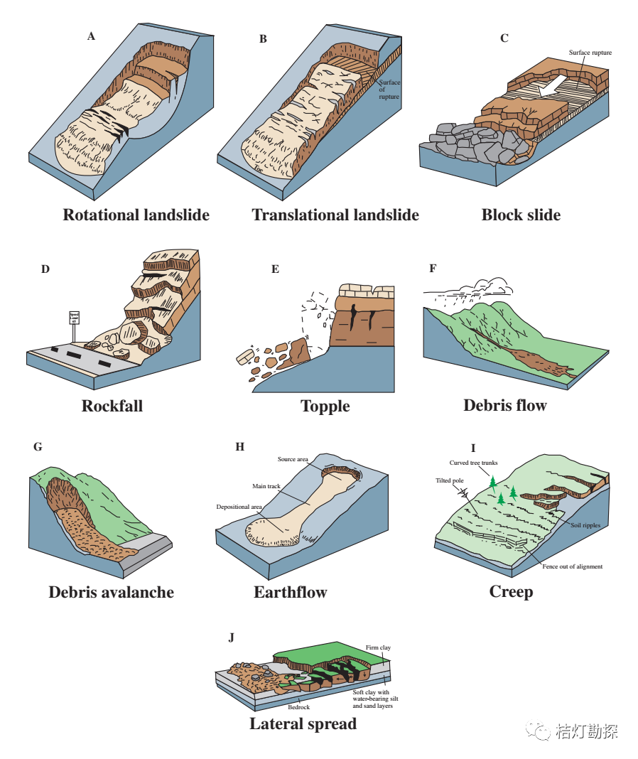 A-旋转滑坡,B-平移滑坡,C-块体滑坡,D-落石,E-崩塌,F-泥石流,G-岩屑崩落,H-土流,I-蠕滑,J-横向弹裂