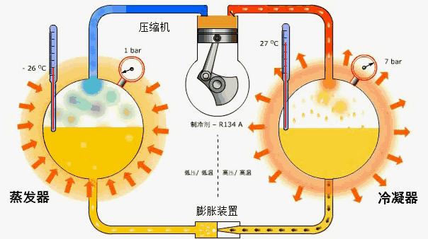 - 压缩机对吸入的气态制冷剂进行压缩,使得制冷剂压力温度升高,制冷剂进入冷凝器放热,气态制冷剂液化,此过程大量放热,这也是一般冰箱后面一般比较热的原因,制冷剂在系统中不断循环从而实现持续制冷。