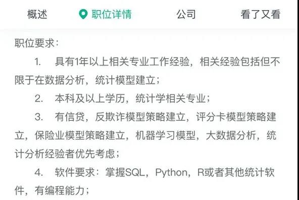 打开求职软件,选金融行业,并搜索关键字“数据分析”,可以看到许多岗位。一般这些岗位的JD(职位描述)长这样: