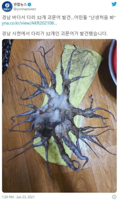 而在6月的韩国,也发现了一件关于章鱼的怪事:当地渔民从海上捕获了一只有着32条腿的畸形章鱼。