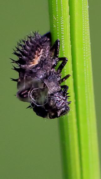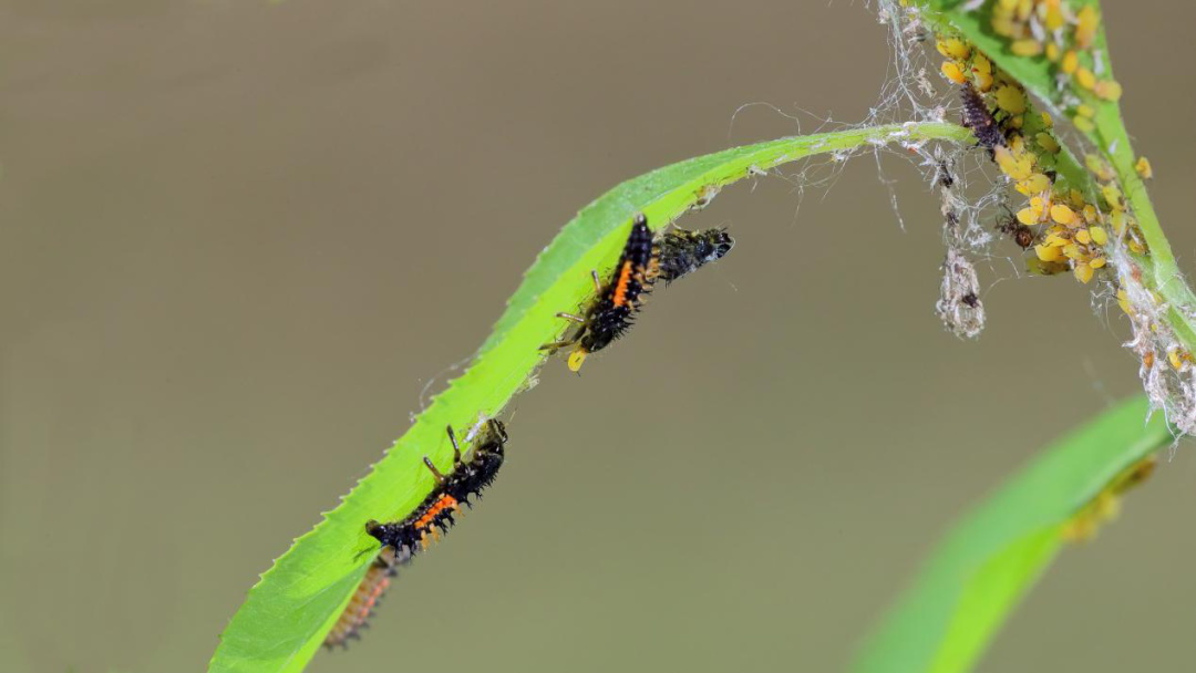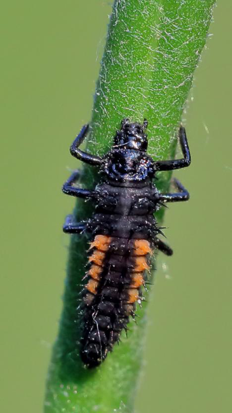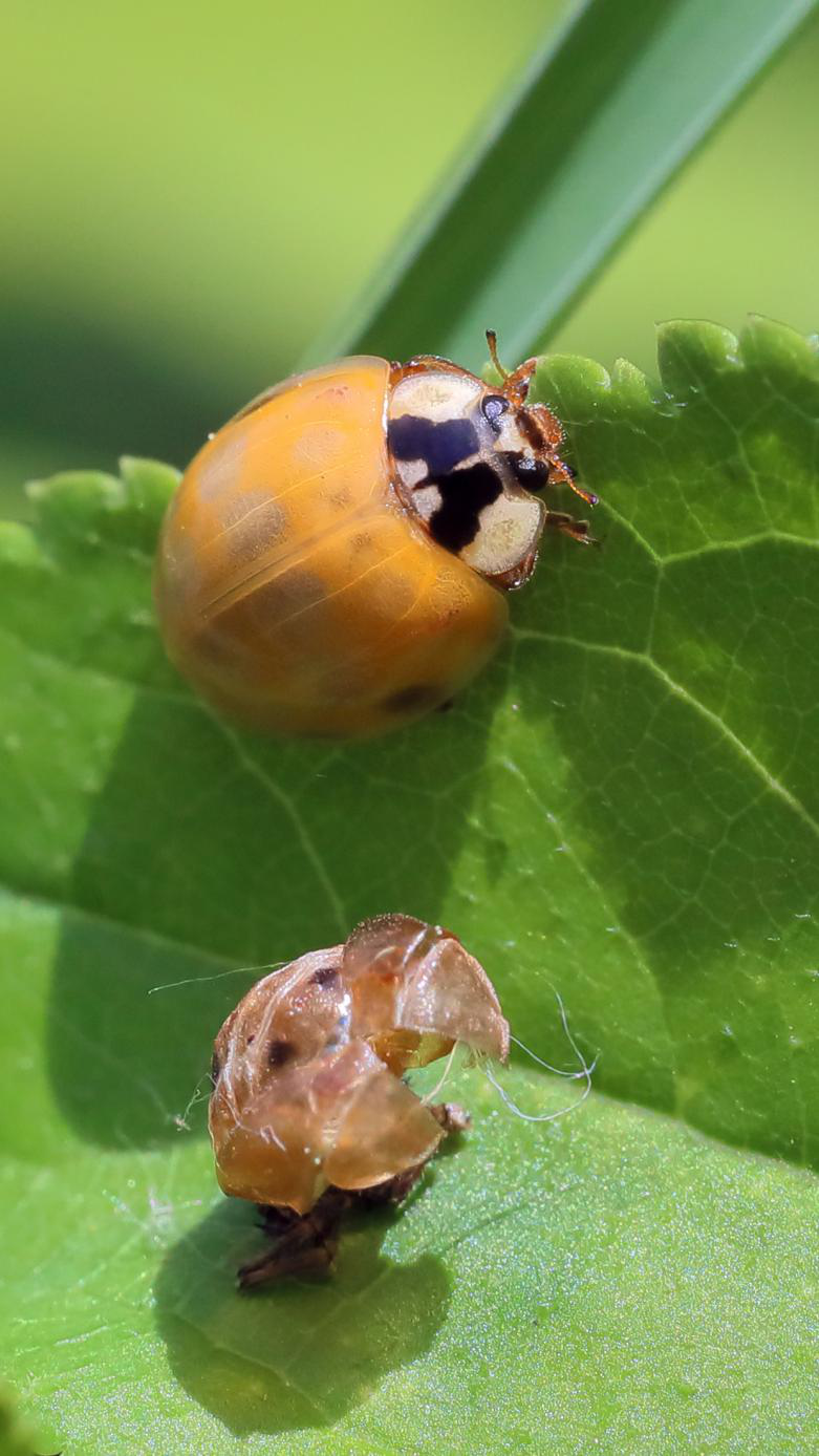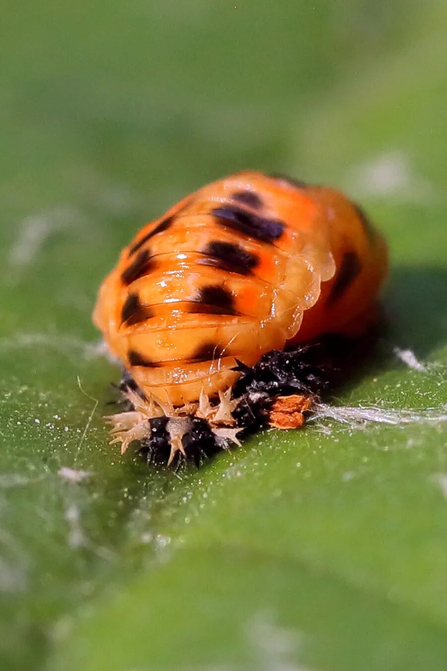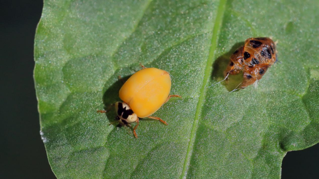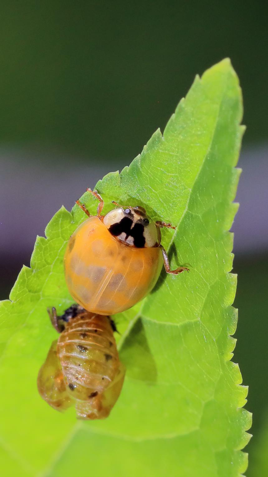 异色瓢虫幼虫的体表有着一层较为坚硬的表皮,它们的伸展性是有限的,因此生长到一定的阶段就会蜕去老皮长出新皮。