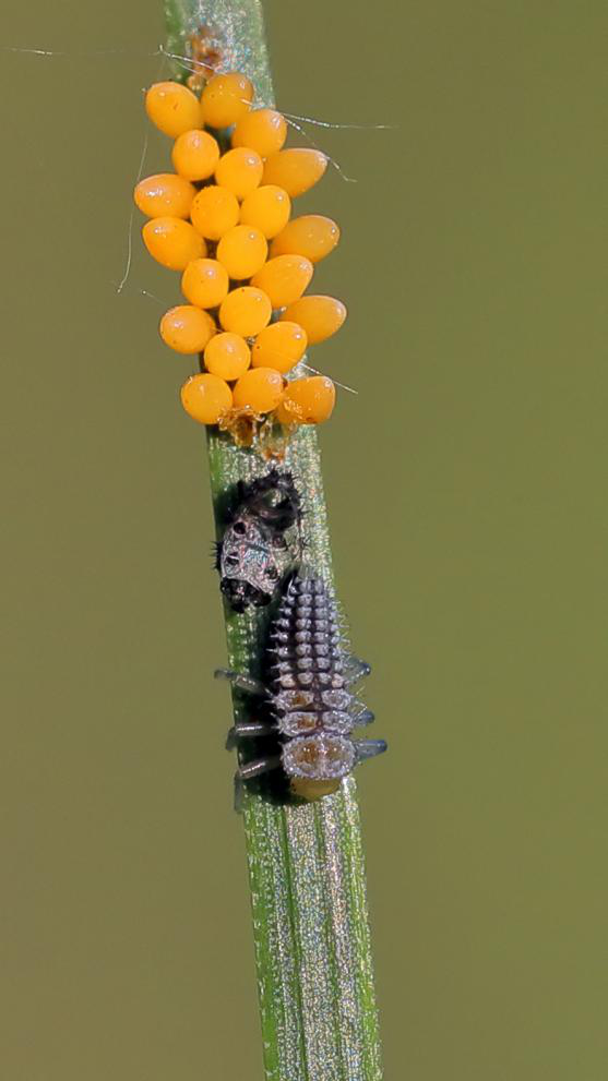 这样戏剧性地认识了异色瓢虫,今年苗圃里的异色瓢虫又格外的多,虫卵到处可见,便有了拍摄记录异色瓢虫完全变态发育过程的念头。这念头一起,前前后后追踪观察拍摄了一个多月,基本上记录了异色瓢虫的整个变态发育全过程。