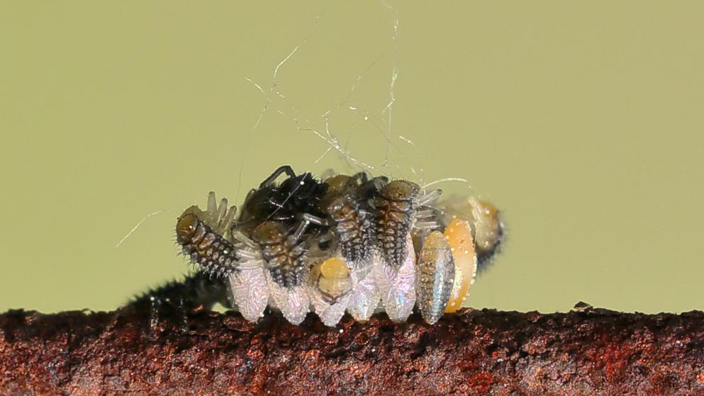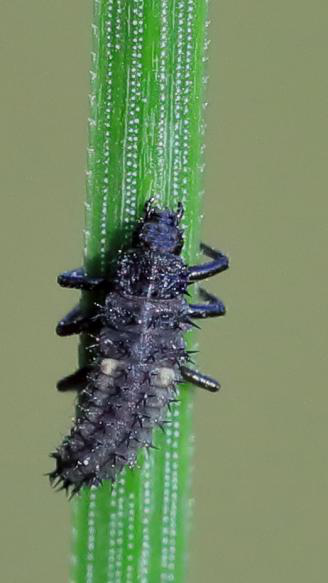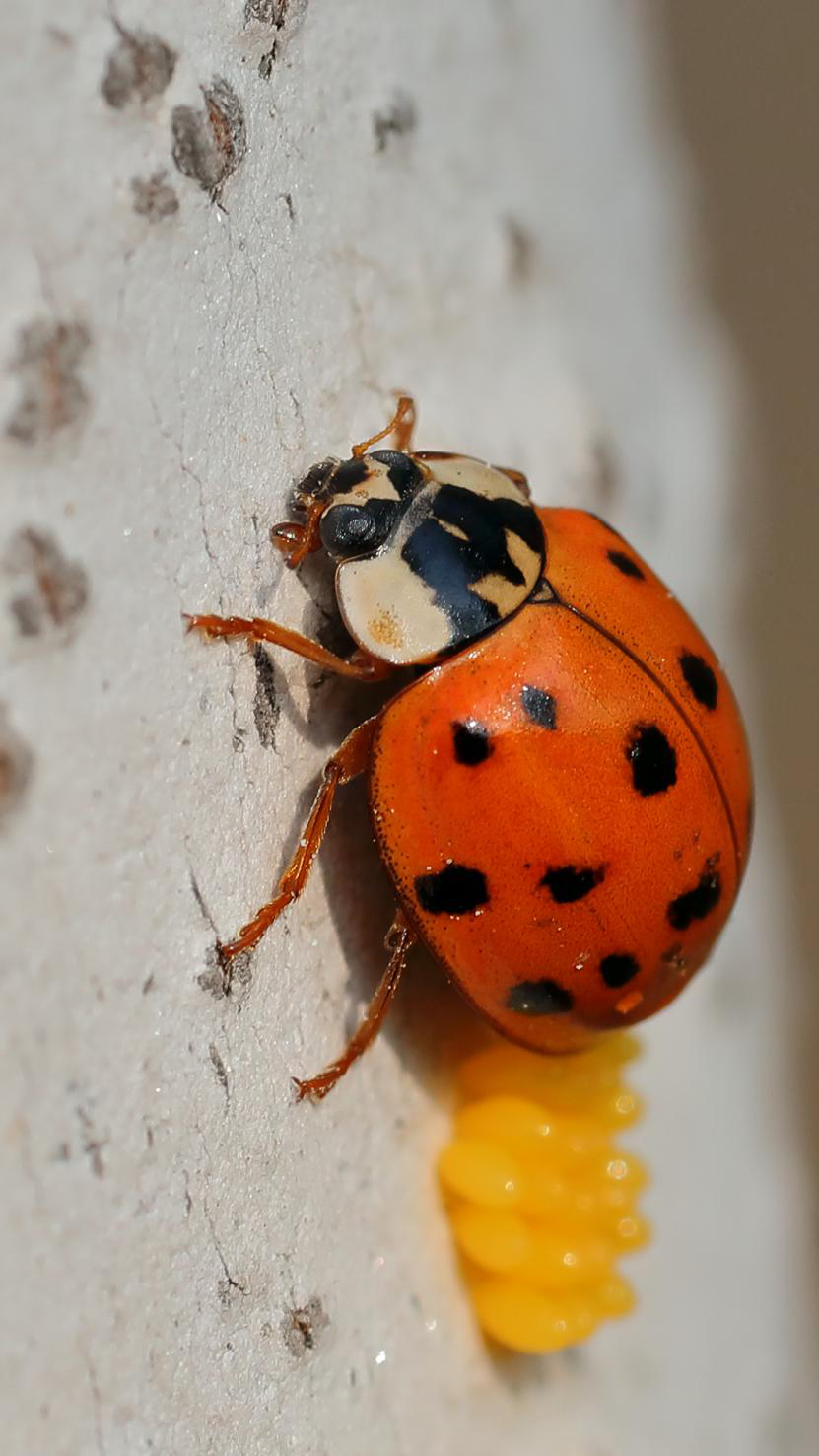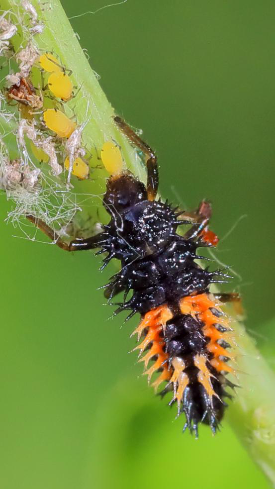 我观察到的,异色瓢虫将卵大部分产在树干上,也有少量卵产在树叶上、干枯的树枝上、树洞中、草叶上、甚至是苗圃为树枝整形的铁丝上,我一度为产在铁丝上的卵担忧,怕阳光晒热了铁丝会影响卵的发育,不过,没过几天,黑色的幼虫便破卵而出,证明了我的担忧是多余的。