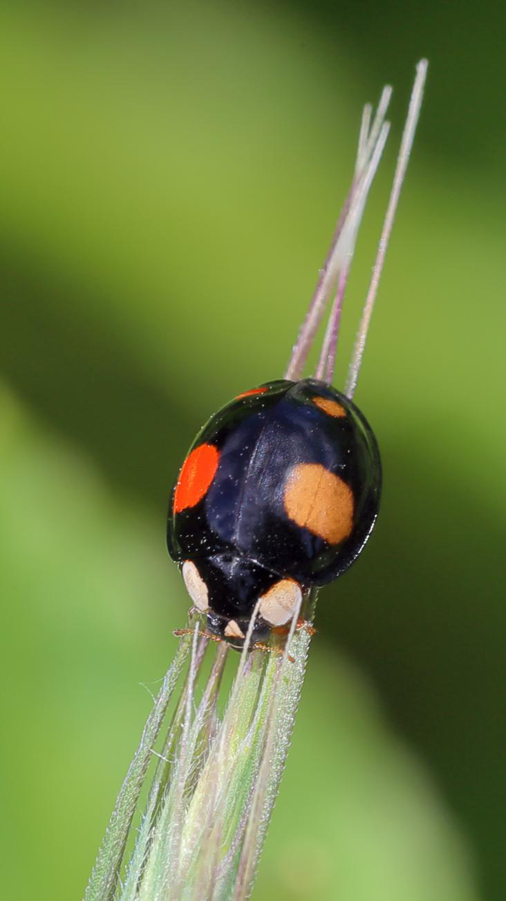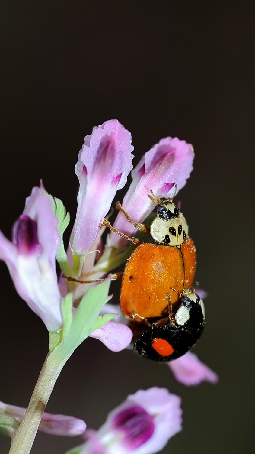 不过,让我惊奇的却是,突然发现了两只鞘翅底色和斑纹完全不同的瓢虫在交尾,这个时候的我好像是发现了新大陆一般,兴奋地围着这对瓢虫前后左右的好一通拍摄!然后,继续在周围观察,却又发现了更多的新大陆,一对对的甚至是红、黑不分,这画面大大超出了我的认知!经查阅,才知道这便是异色瓢虫。