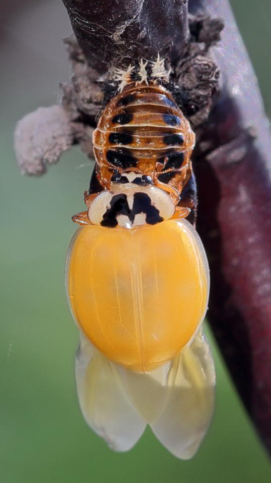 异色瓢虫的早春蛹期在10天左右。之后开始羽化:
