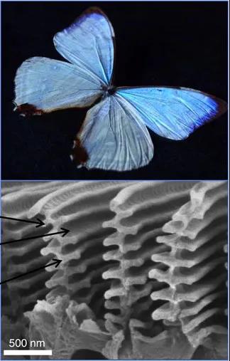 闪蝶翅膀的鲜艳蓝色并不是蓝色素的作用,而是翅膀鳞片的纳米结构在光的散射、衍射、干涉下产生的结构色。闪蝶翅膀的微观结构类似于光栅,每个单元呈松树枝状,由纳米级的小薄片均匀叠加而成,薄片层和空气介质层交替分布,也叫多层膜结构。当光线入射翅膀结构时,松树枝状结构使蓝色波长区域的光得到干涉加强。闪蝶翅膀结构可以让光线向不同方向弯曲和散射,所以从不同角度观察翅膀鳞片时,颜色也是千变万化。在货币防伪、特制涂料和纳米材料中,模仿蝴蝶翅膀的仿生学技术已经得到应用。