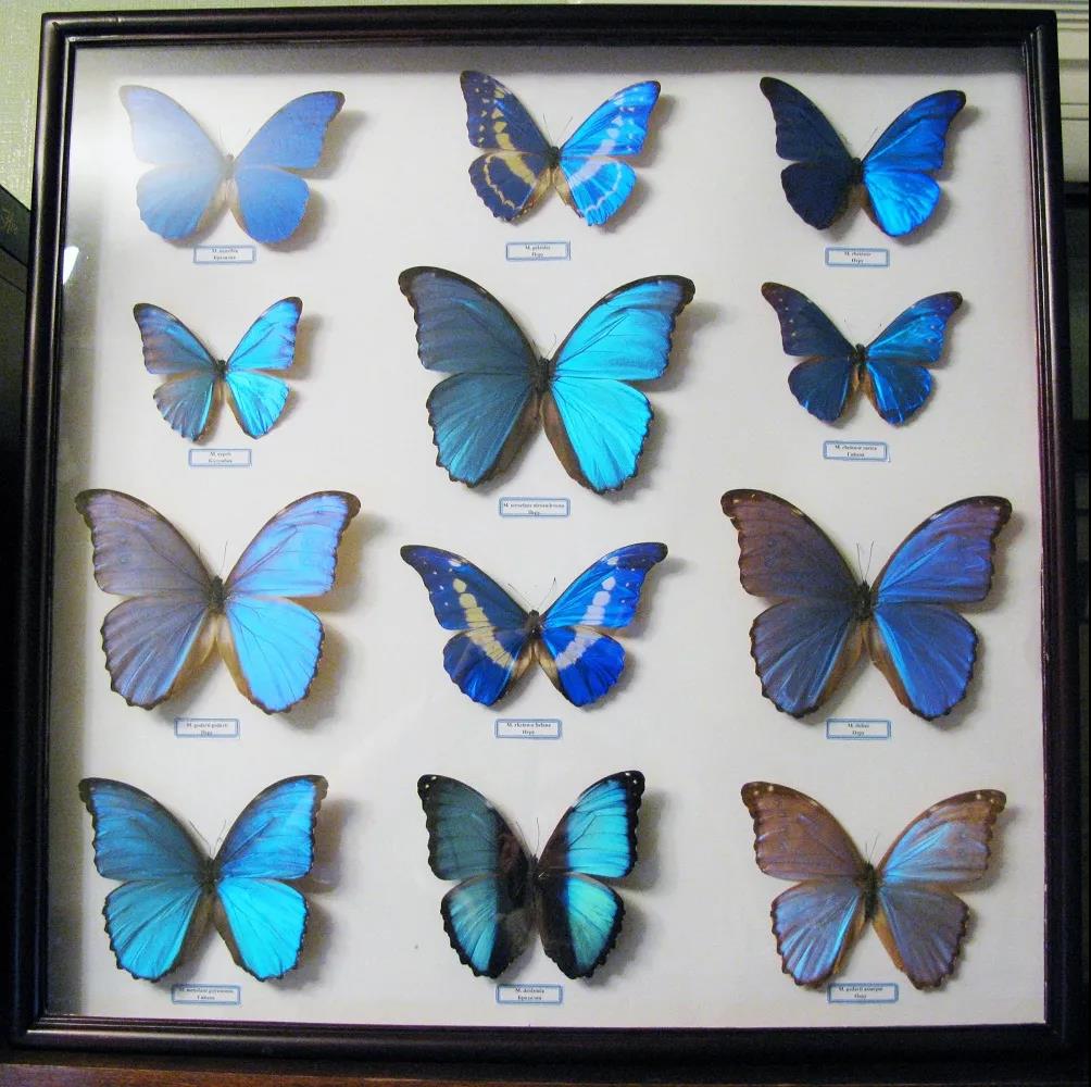 令这位“蝴蝶猎人”可望不可即的蓝色蝴蝶,很可能是蛱蝶科(Nymphalidae)闪蝶亚科(Morphinae)的某一种。闪蝶亚科分布在中南美洲从墨西哥到巴西南部、阿根廷北部一带的森林中,这一家族中相当多的蝴蝶都具有彩虹色泽的华丽蓝色翅膀,成为它们的显著特征。“Morphinae”源自希腊语μορφώ,指爱与美的女神阿芙洛狄忒,也可见这种蝴蝶的美是何等的动人心魄。