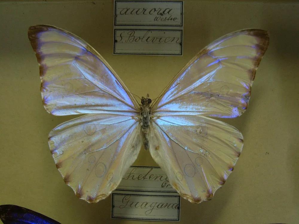 虽然中文名为“光明女神”,但熟悉希腊神话的人会知道,象征曙光的女神名为厄俄斯(Eos),同一位神在罗马神话里叫欧若拉(Aurora)。实际上有一类闪蝶M. aurora已经以曙光女神命名,它的翅膀蓝色较淡,远看像是珠母贝的颜色。