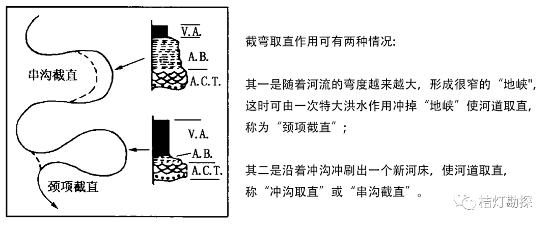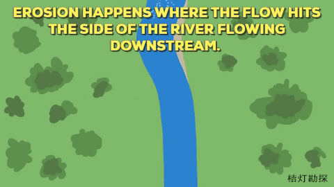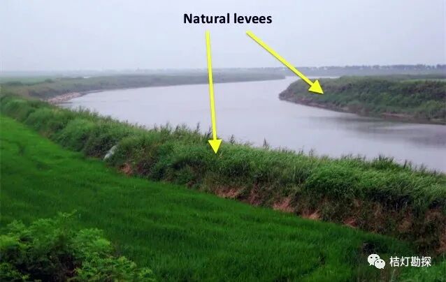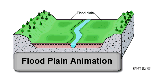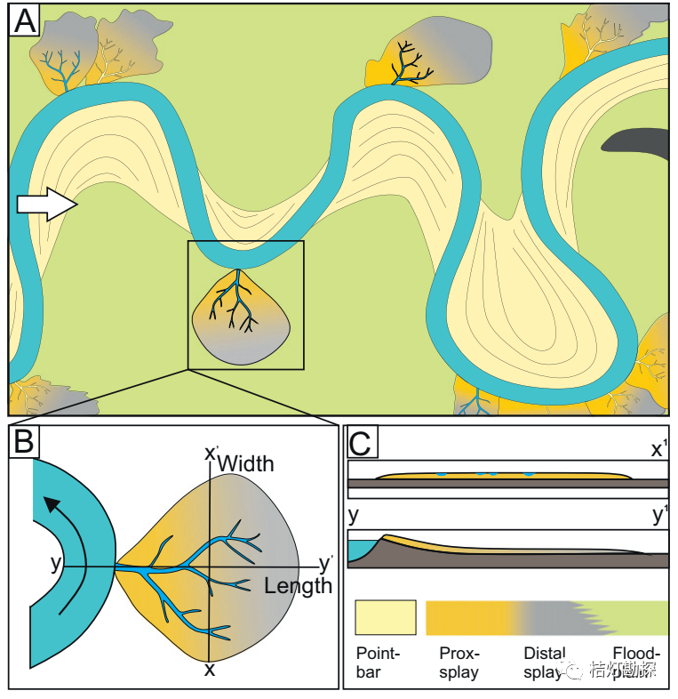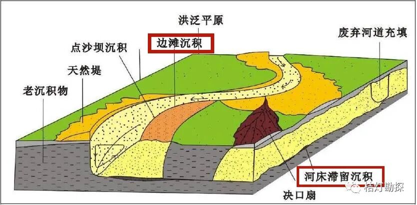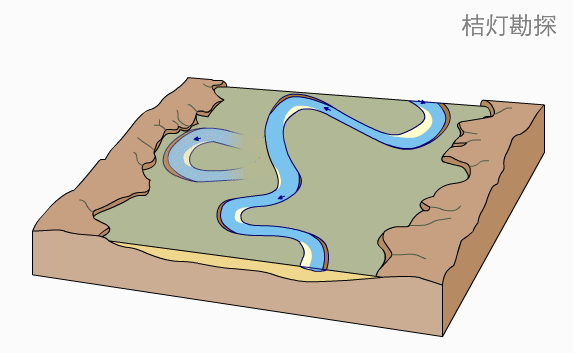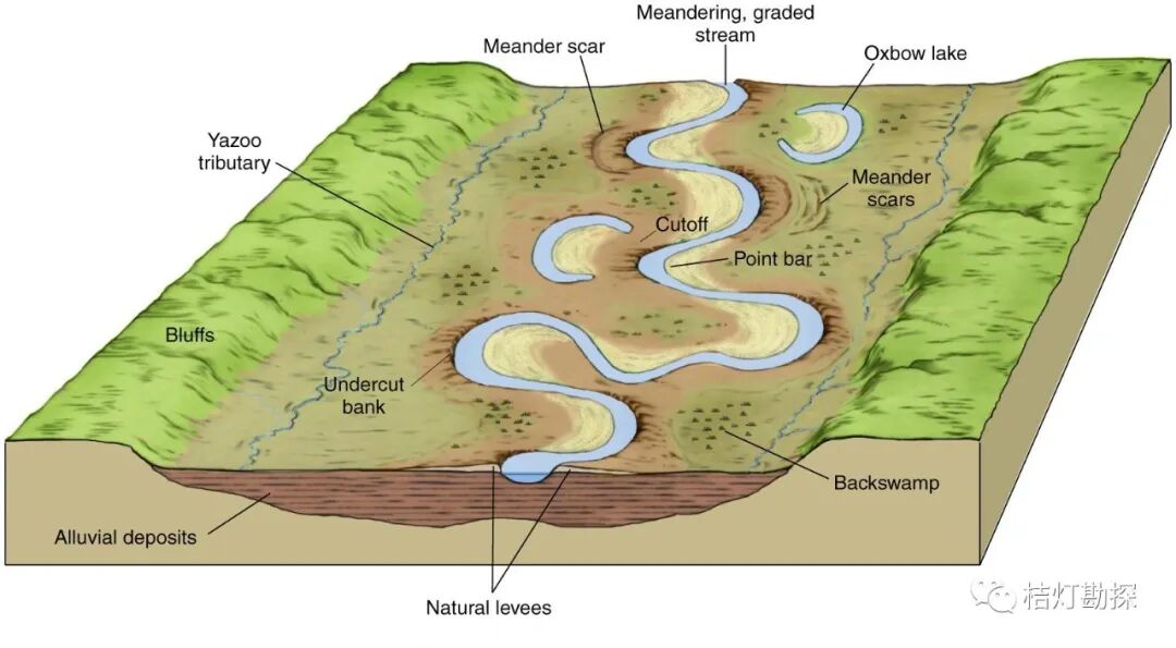 (图源@文献[7]) 平面上,堤岸亚相发育在 河床沉积侧面。 垂向上,堤岸沉积常发育在 河床沉积上部。 与河床沉积相比, 其岩石类型简单,粒度较细, 发育小型交错层理。 天然堤(图源@SlideShare) 堤岸亚相可进一步分为 天然堤和决口扇微相。 天然堤主要由细砂、 粉砂和泥岩组成; 决口扇沉积主要由 细砂和粉砂岩组成, 粒度比天然堤沉积物稍粗。 决口扇示意图(图源@文献[3] ) 河漫亚相位于天然堤外侧, 地势低洼平坦,是洪水泛滥期, 水流漫溢天然堤后, 降低流速导致河流悬浮沉积物 大量堆积而成。 河漫滩(floodplain) 是河床外侧河谷底部 较平坦的部分。 洪水期水漫溢出河床, 淹没平坦河谷谷底, 形成了河漫滩沉积。 该沉积以粉砂岩为主, 亦有粘土岩沉积。 河漫滩形成动画 弯曲河流的截弯取直作用 使被截掉的弯曲河道废弃, 形成牛轭湖。 截弯取直作用可有两种情况: “颈项截直”和“冲 (串)沟取(截)直”。 (图源@文献[1]) 牛轭湖主要发育 砂岩及粘土岩沉积, 砂岩中具交错层理, 粘土岩中发育水平层理, 其沉积序列取决于 河流截直的方式。 牛轭湖形成 03 湖泊相河漫亚相的3个主要微相