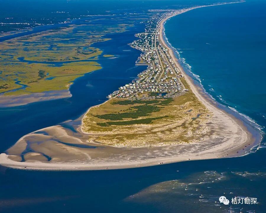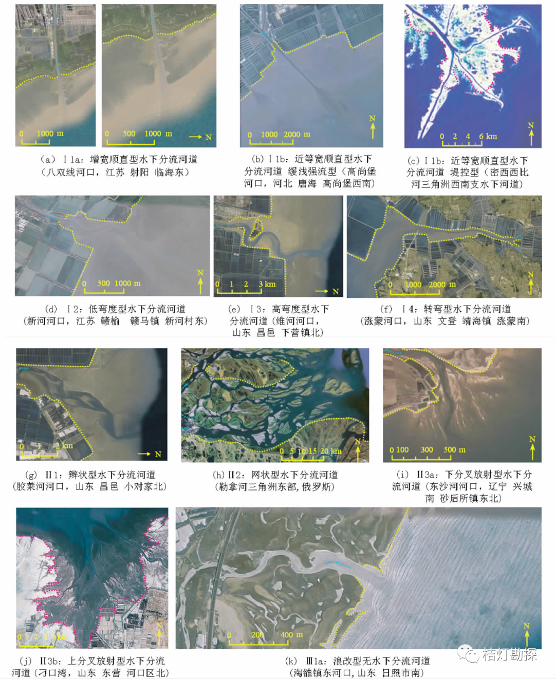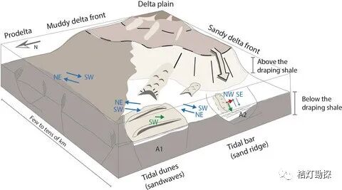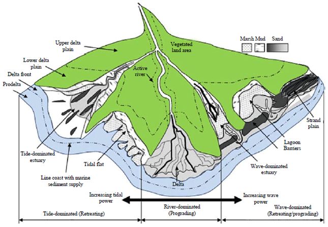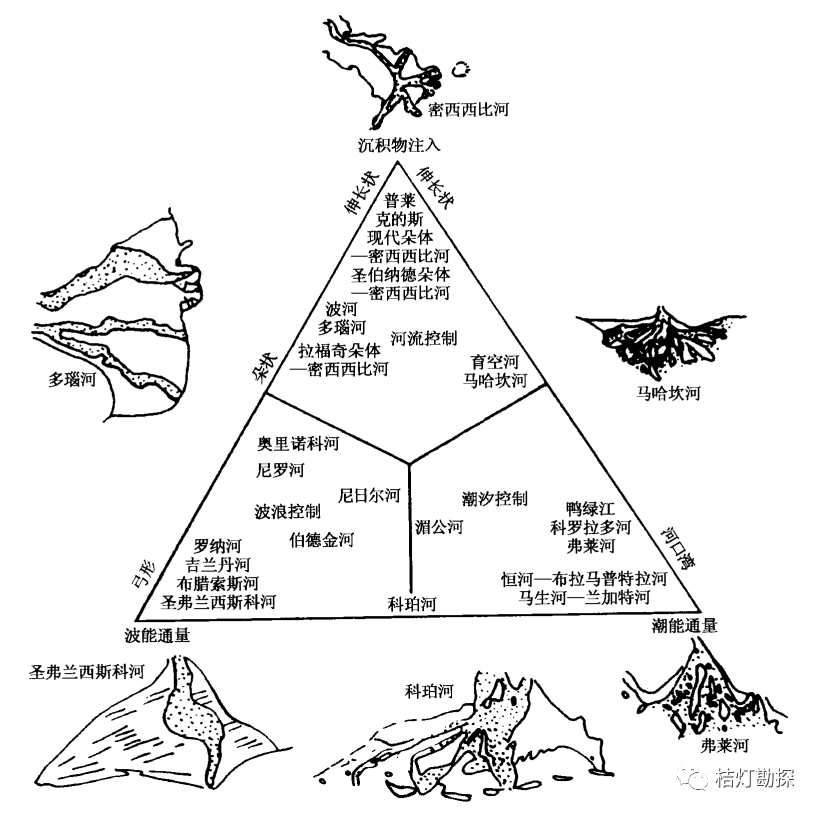 (图源@文献[1]) 一个三角洲可以根据其 沉积环境和沉积相特征, 划分出三角洲平原、 三角洲前缘和前三角洲 3个亚相及多个微相。 三角洲平原是 三角洲的陆上沉积部分, 它与河流体系的分界是从 河流大量分叉处开始, 至海平面以上的广大河口区。 勒拿河三角洲(图源@NASA) 三角洲平原沉积 (delta plain) 的亚环境多种多样, 以分支流河道为格架, 分支流河道的两侧有 天然堤、决口扇, 而分支流间地区常发育有 沼泽、湖泊和分支间湾等。 三角洲前缘 (delta front)亚相 处于海平面以下, 呈环带状分布于 三角洲平原向海洋一侧边缘, 为河流和海水的剧烈交锋带。 (图源@scialert.net) 三角洲前缘是三角洲 最活跃的沉积中心。 进一步可划分出 水下分支河道、水下天然堤、 支流间湾、分支河口沙坝、 远沙坝、三角洲前缘席状砂等 沉积微相。 现代水下分流河道河流类型及划分(图源@文献[5]) 前三角洲(prodelta) 位于三角洲前缘前方, 是河控三角洲体系中 分布最广、沉积最厚的地区。 沉积物大部分在 波基面以下深度范围内形成。 (图源@Wiley Online Library) 岩性主要由暗灰色粘土和 粉砂质粘土组成, 常发育水平层理及 块状层理, 并常见有广盐性的生物化石, 如介形虫、瓣鳃类等。 前三角洲沉积实例(图源@文献[6]) 05 障壁岛、潟湖、潮坪和河口湾相