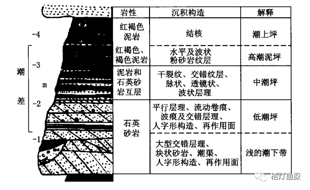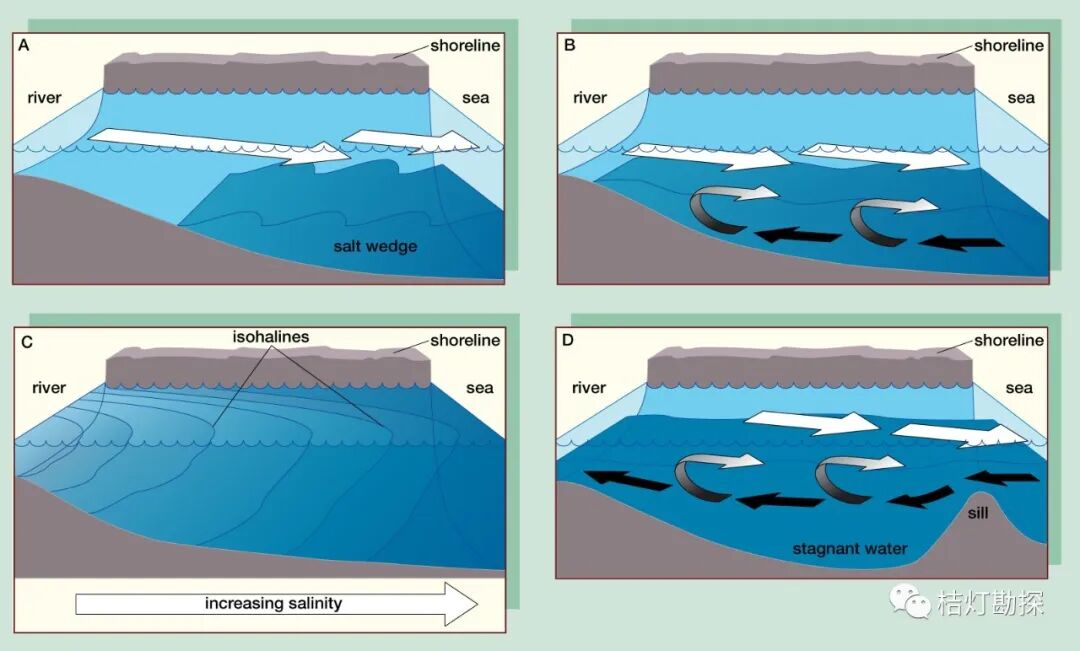 障壁岛海滩体系(图源@google.com) 障壁岛岩体形态呈 与海岸平行的狭长带状。 其长度一般 几公里至几十公里, 宽数百米至数千米, 厚数米至数十米, 剖面上呈底平顶凸的透镜状。 障壁岛(图源@维基百科) 潟湖是为海岸所限制、 被障壁岛所遮拦的浅水盆地。 它以潮道与广海相通或 与广海呈半隔绝状态。 法国维克海岸潟湖(图源@SIEL) 潟湖中波浪作用较弱, 其环境相对安静低能, 沉积物以细粒陆源物质和 化学沉积物质为主。 含盐度高于或低于正常海水, 这是潟湖环境的一个重要特点。 潟湖(图源@eatsleepcruise.com) 潮坪多发育在波浪能量低、 具明显潮汐周期(大中潮差)的 平缓倾斜的海岸地区, 或形成于潟湖周缘、 河口湾和受潮汐影响的 三角洲沉积地区。 潮坪沉积的理想层序(图源@文献[1]) 一般来说,潮坪由 被潮道和潮沟 所切割的平原组成, 可分为潮上带、 潮间带和潮下带。 其中构成潮坪的主要部分是 潮间带,也称为潮间坪。 (图源@image.baidu.com) 河口湾发育于 潮汐作用强烈的海岸河口地区。 当海水大规模入侵, 海岸下沉,河流下游河谷 沉溺于海平面下, 在海岸河口区形成向海扩展的 漏斗或喇叭状狭长海湾,即河口湾。 河口的四种主要类型 06 海相组沉积相