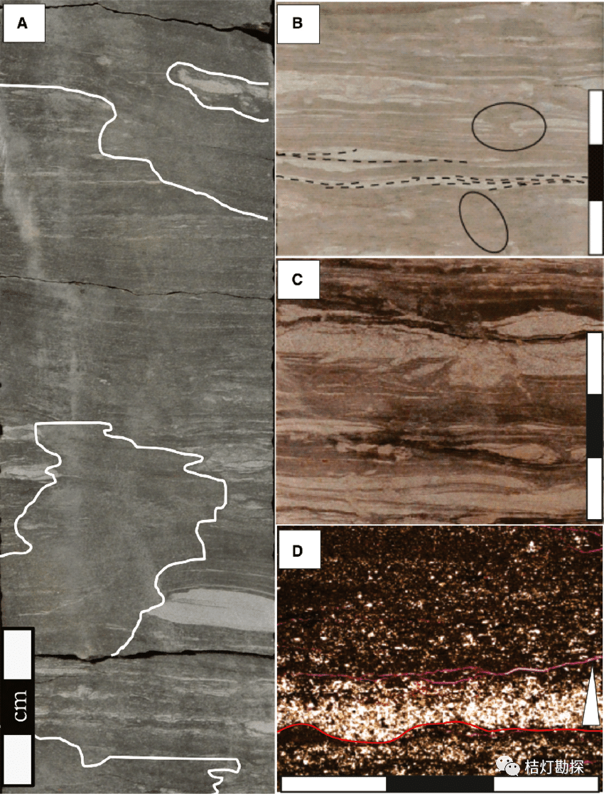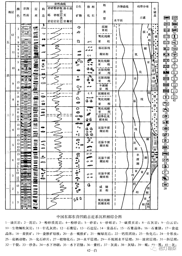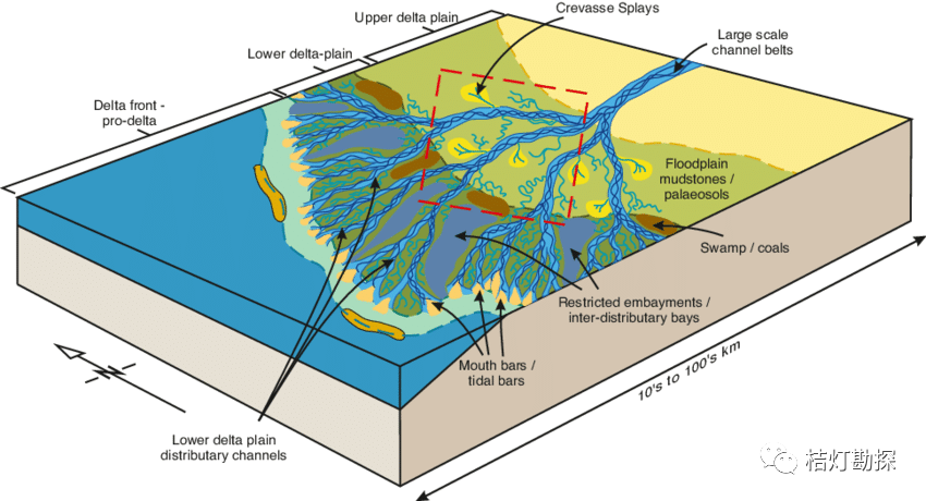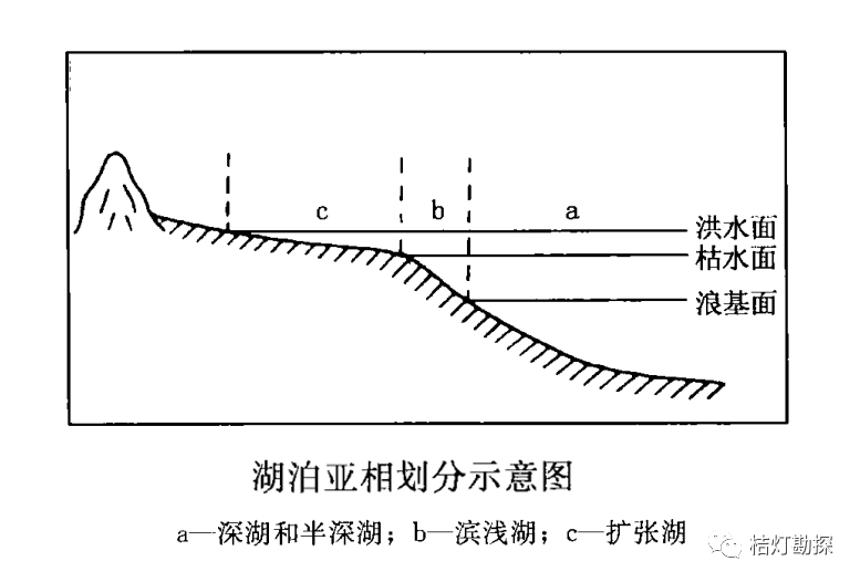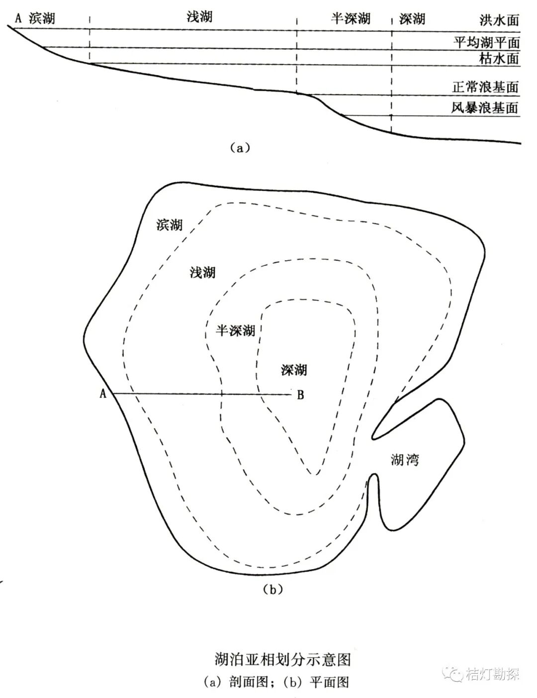 湖泊是大陆上地形相对低洼 和流水汇集的地区。 不仅有大量碎屑物质倾入湖盆, 且河道在湖底可以继续延伸, 从而改变湖泊砂体分布状况。 根据沉积岩颜色、沉积构造、 厚度等沉积标志以及 洪水面、枯水面、浪基面位置 可将湖泊划分为深湖和半深湖、 滨浅湖、扩张湖等亚相类型。 (图源@文献[1]) 深湖和半深湖亚相位于 浪基面以下的水体较深部位, 为缺氧还原坏境。 岩性以灰黑色、 深灰色泥页岩为特征, 常见油页岩、薄层泥灰岩或 白云岩夹层。 泥页岩(图源@douglasfossils.com) 在长期稳定持续下降、 沉积中心与沉降中心 吻合的大型湖盆中, 深湖亚相沉积厚度大、分布广, 面积甚至超过整个湖盆的60%。 San Nicandro Fm厚粉质矿床剖面(深湖相)(图源@文献[4]) 浅湖沉积位于 滨湖亚相内侧至 浪基面以上的地带, 水体较滨湖区深, 基本位于水下, 沉积物受波浪和 湖流作用的影响较强。 (图源@文献[1]) 岩石类型以浅灰色、 灰绿色粘土岩和粉砂岩为主。 层理类型多以水平、 波状层理为主, 水动力强度较大的浅湖区 具小型交错层理。 湖相交错层理(图源@Outside The Interzone) 滨湖亚相位于湖盆边缘, 水位较浅, 常接受来自湖岸的粗碎屑物质。 其水动力条件复杂, 击岸浪和回流的冲刷、 淘洗对沉积物的改造作用强烈。 地形坡度决定了 滨湖沉积宽度, 若地形陡,则宽度窄。 对于古代湖相沉积来说, 很难将其与浅湖亚相完全分开, 故经常合称滨一浅湖亚相。 (图源@文献[1]) 扩张湖是指枯水期湖面与 洪水期湖面之间 宽缓的沉积地带。 扩张湖沉积物主要在 气候较干旱的洪水期发生堆积, 此时河水能量大, 输入大量泥砂沉积物。 (图源@Syed Mehdi Bukhari) 当湖水收缩至枯水期, 扩张期沉积物暴露于地表 受暴晒形成泥裂 并氧化成红色。 因此地层剖面上表现为 河流砂砾岩、泥质岩与 分布稳定的湖相杂色泥岩、 泥灰岩的频繁互层。 湖相泥岩与灰岩(图源@文献[5] ) 04 三角洲相