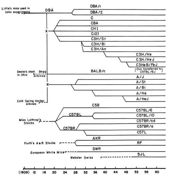 早在16世纪,就有一部分科学家利用小鼠进行科学研究,但仅限于比较解剖学领域。至于小鼠正式成为动物实验的“主角”,则要等到20世纪了。20世纪初,孟德尔遗传定律再次受到生物学界的关注,学术界开始尝试在不同物种中对其进行验证,小鼠作为哺乳动物中的一员,也成了重要的研究对象。一时间各大科研机构对小鼠的需求量激增,于是有人做起了饲养、售卖实验用小鼠的生意。马萨诸塞州的一位名叫阿比·拉斯罗普(Abbie Lathrop)的女士,由于小鼠繁殖计划和饲养记录详细、完备,很快就成为了包括哈佛大学在内的多所权威实验室的主要小鼠供应商。1907年,哈佛大学的克拉伦斯·库克·利特尔(Clarence Cook Little)开始在导师的指导下,对小鼠皮毛颜色的遗传规律进行研究,经过二十多代的选择培育,世界上第一个纯种的近交品系小鼠(DBA小鼠)诞生了。与大家最熟悉的小白鼠不同,DBA小鼠的毛色不是纯白色,而是可以稳定遗传的浅棕色,实验用小白鼠的出现还要更晚一些。1912年,美国纽约纪念医院的哈希·巴格(Halsey J.Bagg)购得一批白化小鼠原种,经过多代近交培育,最终获得品系名为BALB/c的白化小鼠品系。这些小鼠特征大家非常熟悉:纯白的毛发,红色的眼睛,小巧圆润的身体。自此,小白鼠正式登上历史舞台,并逐渐成为大家心中最典型的实验动物形象。虽然小白鼠名声在外,但其实实验用小鼠的毛色相当丰富,除了浅棕色和白色,黑色和灰色也十分常见。此外还有不长毛发的裸鼠,也是很多实验室的必需品。