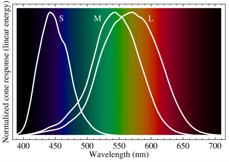 这三种细胞分别为标记为S,M,L,分别感受不同颜色的光(如下图)。S视锥细胞感受短波长颜色光,M视锥细胞感受中波长颜色光,L视锥细胞感受长波长颜色光。