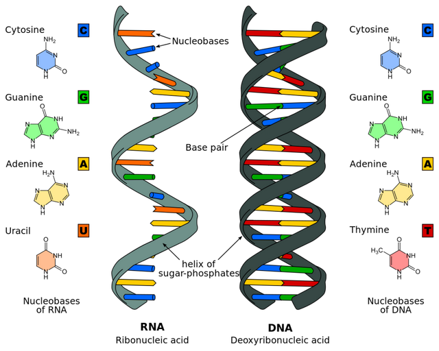 图1. RNA、DNA结构及其碱基种类。正常情况下,核酸中碱基按照A=T、C≡G的方式进行配对,在RNA中U为A=U和C≡G,图中虚线代表氢键。来源 | wikipedia