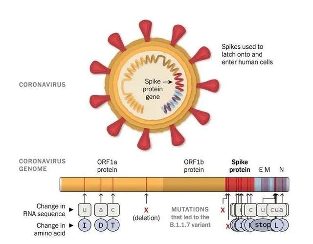 图5. 新冠病毒alpha株的基因突变位点示意图。图中最下边标记的就是突变,主要集中在后半段。来源 |《纽约时报》
