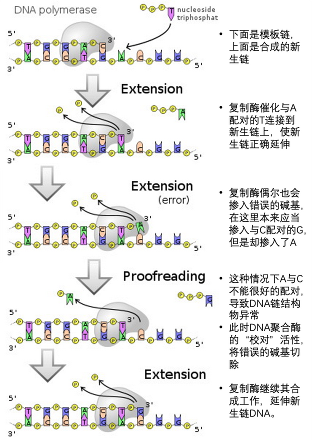 突变过多会让基因组信息不稳定,影响基因组的功能。因此,DNA聚合酶往往具有校对活性(proofreading),这是一种3’到5’的核酸外切酶活性,可以将错误的碱基切掉,再继续连接正确的碱基。DNA聚合酶的保真性可以达到每复制107 到109 个碱基才发生一次错误,相当于100万字的小说抄100遍才出现一次错误(《红楼梦》约79万字)。