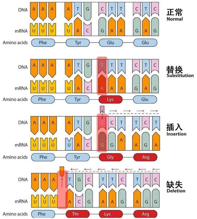 移码突变中,由于编码序列在插入或缺失(非三整倍数)碱基后,造成读码框移码,原有蛋白质编码序列被破坏,蛋白质不能正常表达。这种情况类似于一个五言绝句古诗,插入或删除掉几个字后,你再按照五字一句来读,就不知所云了。
