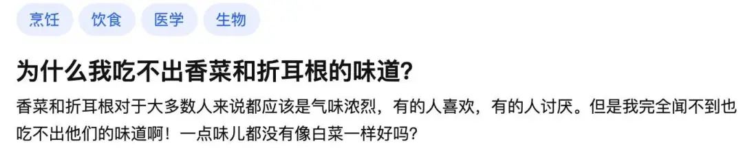 它对香菜中的醛类物质敏感,导致携带者吃香菜时,以为吃了一只被肥皂水泡过的臭大姐,折耳根应该也是一样的道理。
