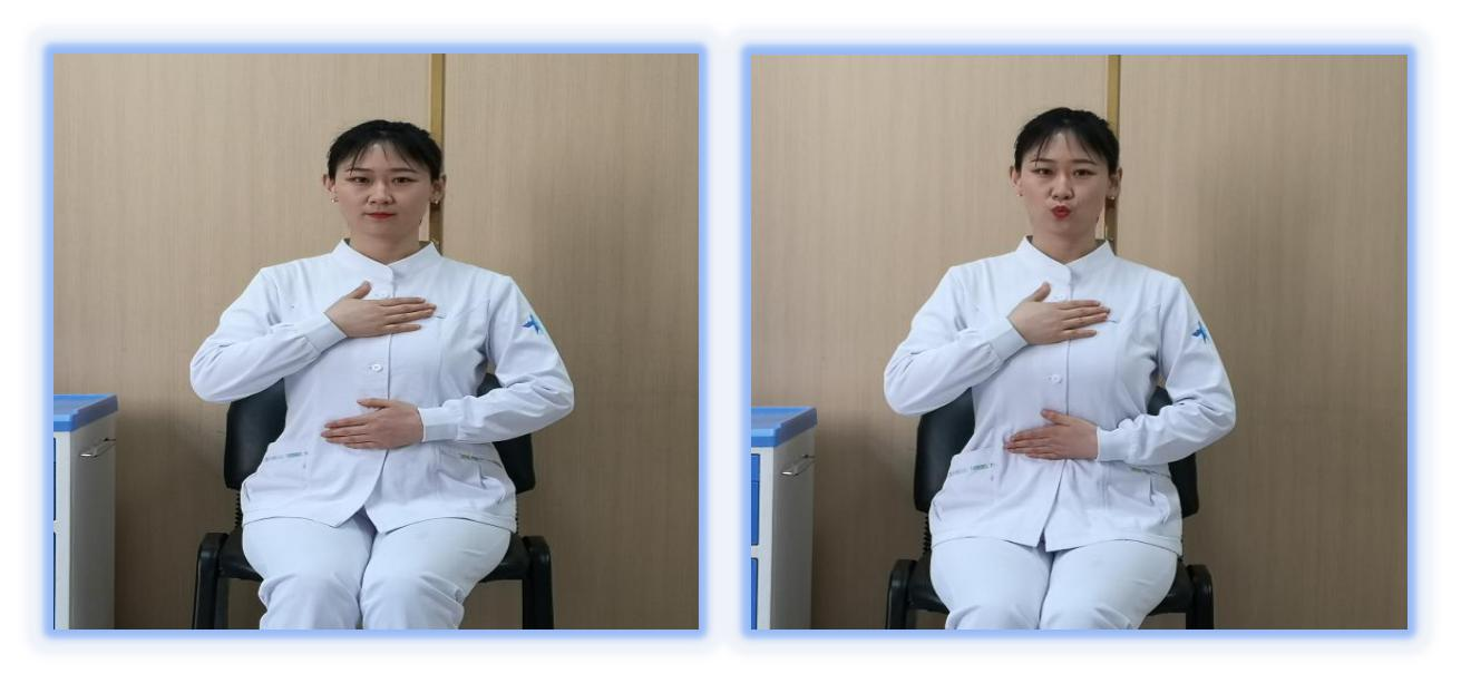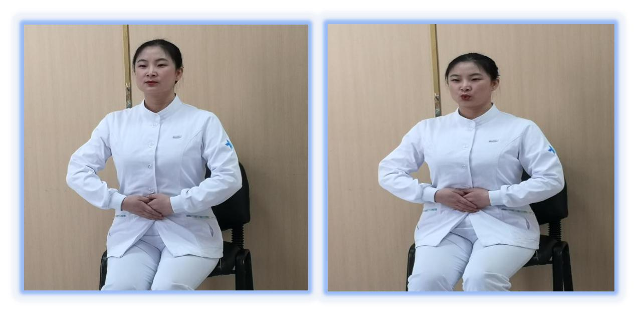 取坐位,双手交叉放于腹部,用鼻深吸气使腹部隆起;用嘴缓慢呼气,双手 按压腹部使腹部缓缓下沉,直到呼气结束,注意呼气时嘴要呈吹口哨状哦。吸气 与呼气的比例为 1:2 至 1:3。再做一次,回位。