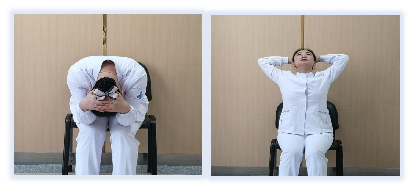 取坐位,将双手交叉放于后脑勺,低头弯腰,双臂尽量贴紧脸颊,躯干处于 放松状态。缓慢吸气,吸气时头后仰,脊柱逐渐伸直,双臂尽量往后上展开,随 后缓慢呼气,回到起始位。再做一次,回位。