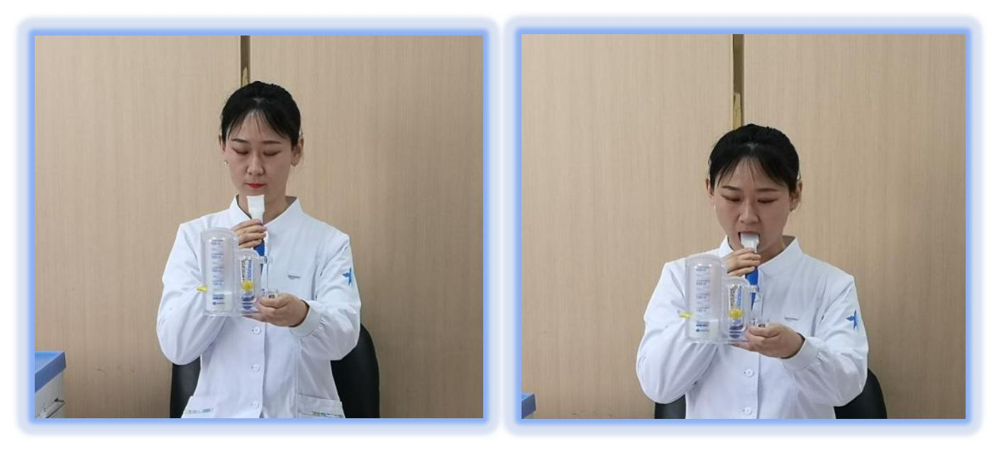 训练方法:取舒适坐位,一手持呼吸训练器,一手持通气连接管口含嘴端,先调 节呼吸通气管至合适长度。现在开始,用鼻吸气,用嘴呼气,在呼气末,用嘴唇 吸气时腹部 隆起 呼气时腹部内 陷 用 鼻 吸 气 , 吸 气:1,2,3 秒 用嘴呼气,呈吹 口哨状,呼气: 1,2,3,4,5,6 秒完全包裹口含嘴,缓慢深吸气,使小黄球尽量保持在流速标识中间的“笑脸”位 置,取出口含嘴,缓慢呼气,平静呼吸 1 次。可重复以上方法,注意每次吸气间 隔不少于 6 秒。