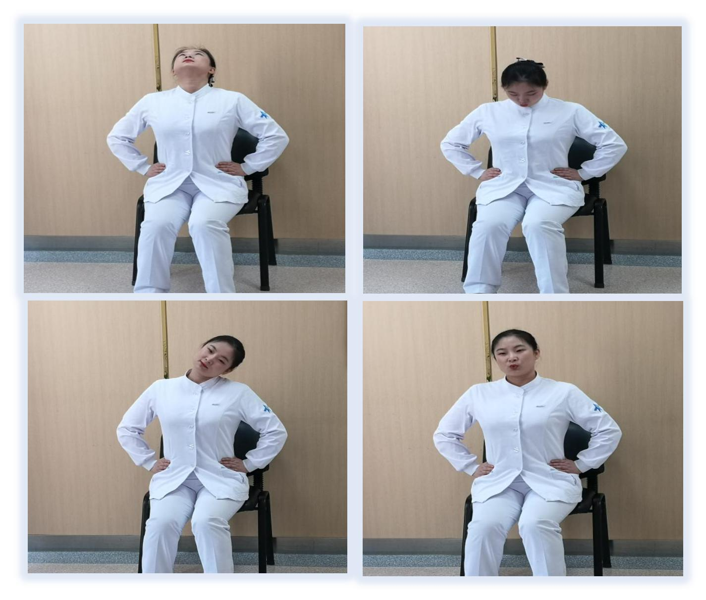 取坐位,双手叉腰。吸气时仰头,头部尽量后仰;呼气时低头,下颌尽量贴 向胸骨,头部回位;吸气,头部缓慢向右侧偏,头部尽量贴向肩,呼气时回头; 再次,吸气,头部缓慢向左侧偏,头部尽量贴向肩,呼气时回头。回位。