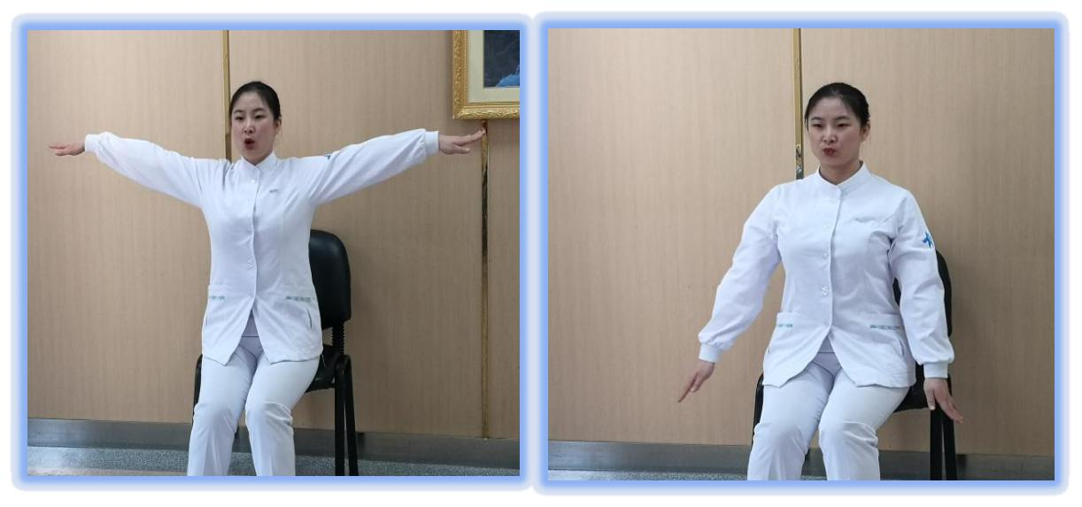 端坐位,将双手放置于腿上,吸气时挺腰,慢慢抬起双臂与肩平行 180°; 呼气时身体放松,慢慢放下双臂。再做一次,回位。