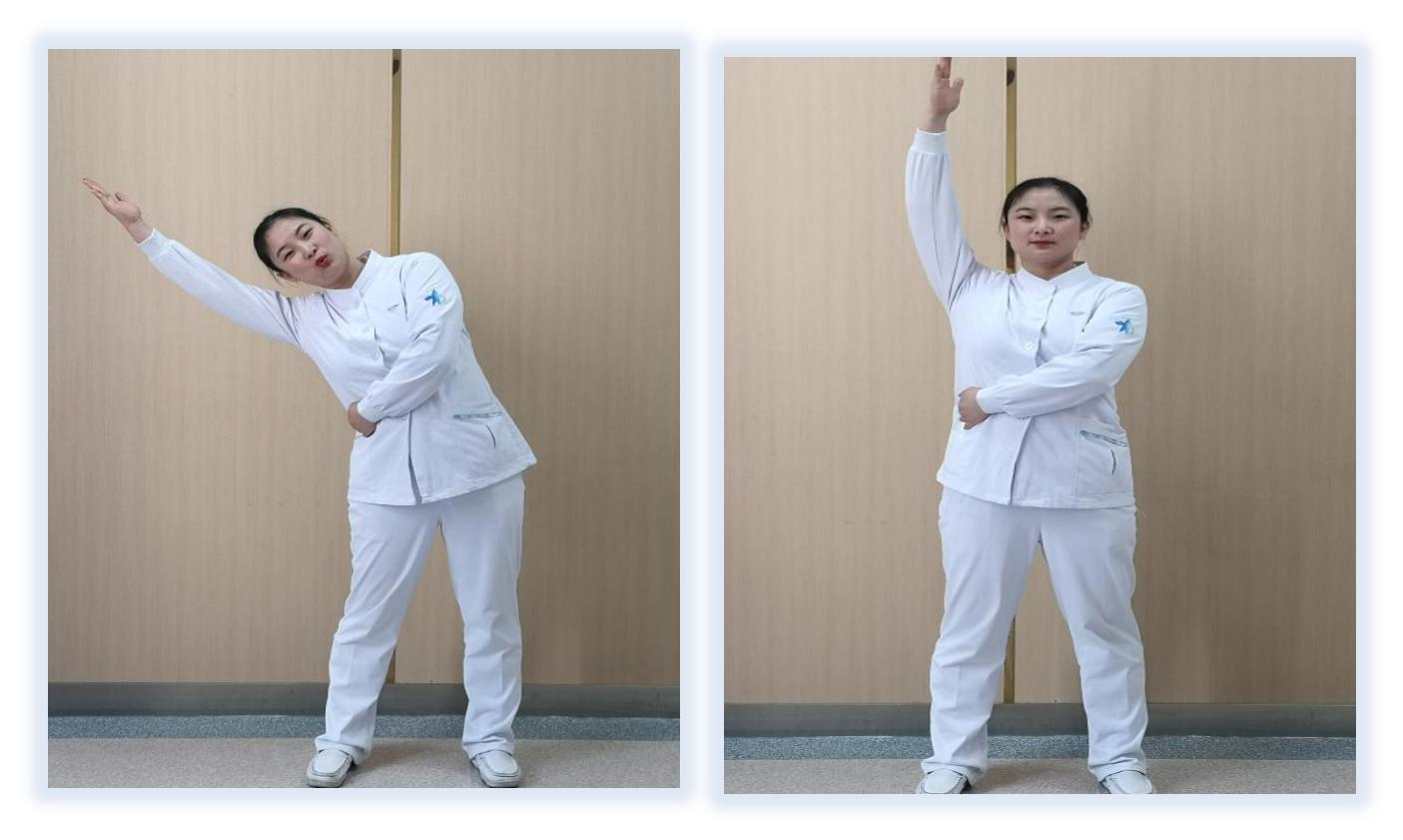 站立位,双腿分开,吸气时左手抱向右侧腰,右手举过头顶;呼气时向右侧 弯腰并还原到站立位,再反方向重复进行练习。回位。