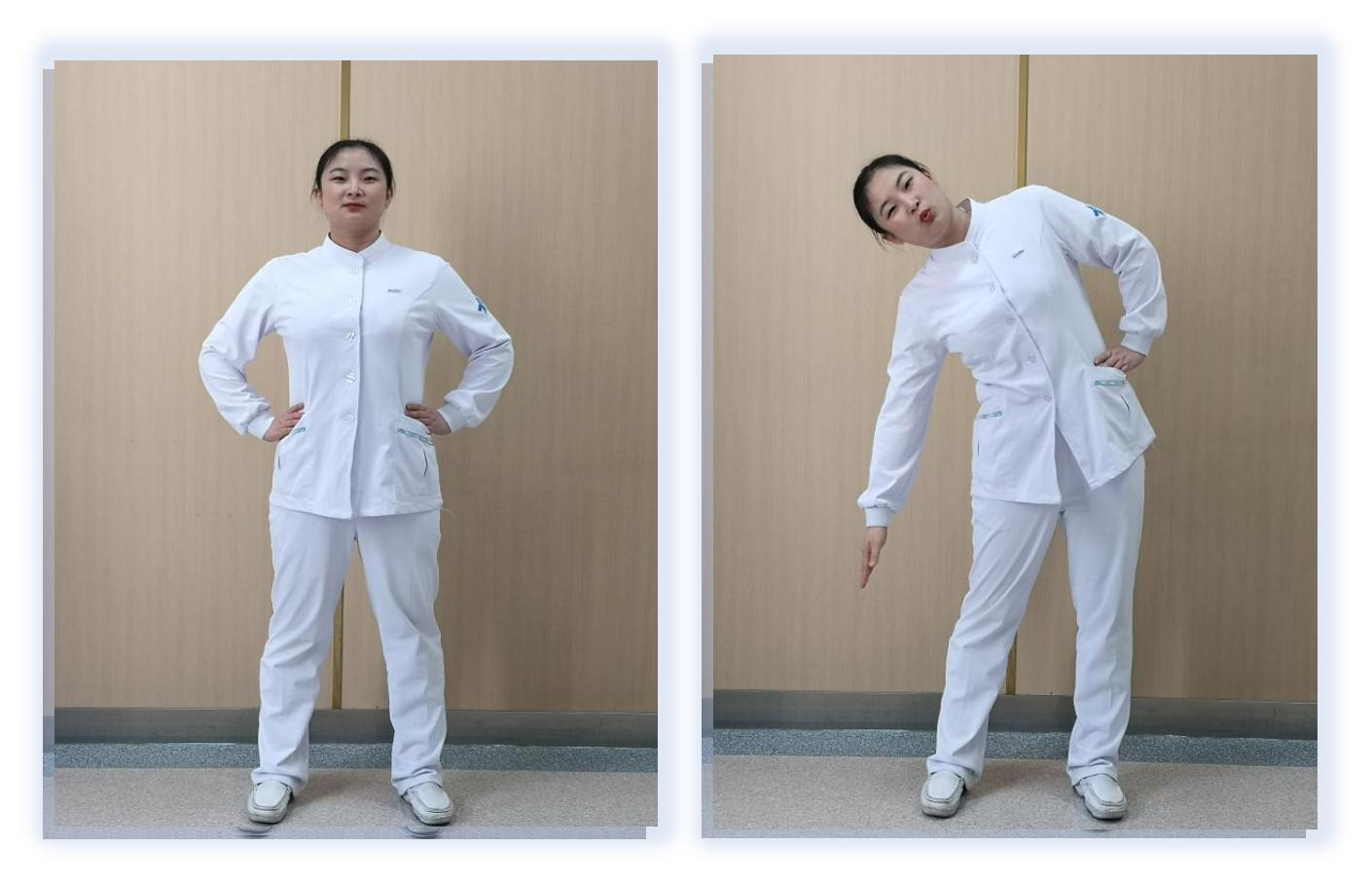 站立位,吸气时双手叉腰,呼气时向右侧弯腰同时右臂下垂;吸气时还原为 叉腰站立,再反方向重复进行练习。回位。注意呼吸与节律相互配合。