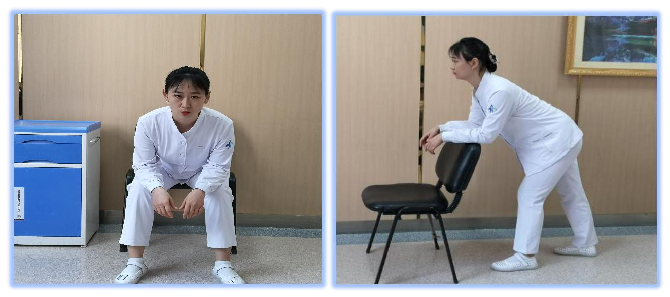 (2)坐位:双足分开,与肩同宽,身体前倾,双臂支撑在大腿的上方。