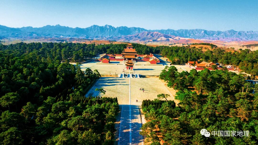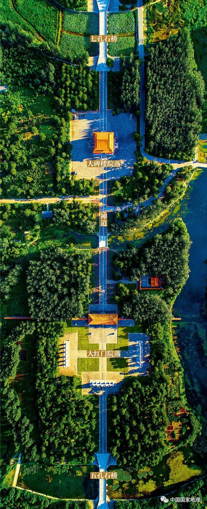 高空俯视下,从陵区大门——大红门院落一路往北,经神道,至大碑楼院落,呈现出“宽”—“窄”—“宽”的“工”字形构图,这种设计会使身在其中的人们,产生层次丰富、步移景异的视觉体验。(摄影/王江山,图自《中华遗产》2019年4月)