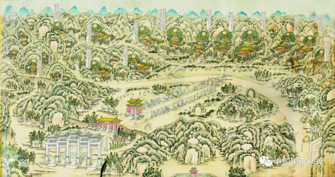 在这幅清光绪年间所绘的十三陵全图中,不仅标识出十三座陵园的风水吉地与主人生平,周边的妃子墓、神路和各类祭祀建筑、寺庙,甚至陵墙、关卡都尽收眼底。当年十三陵与世隔绝,俨然是一片恢弘而宁静的帝王谷。(图自《中华遗产》2013年5月)