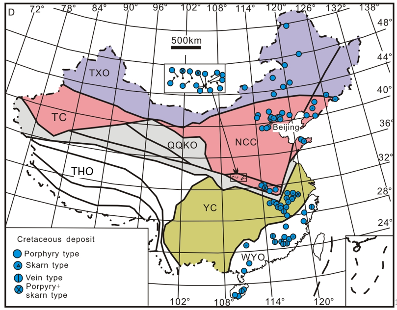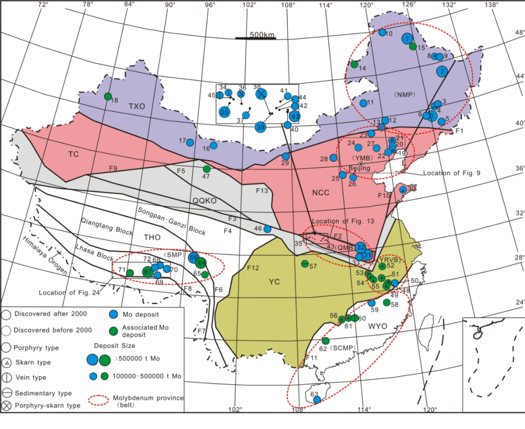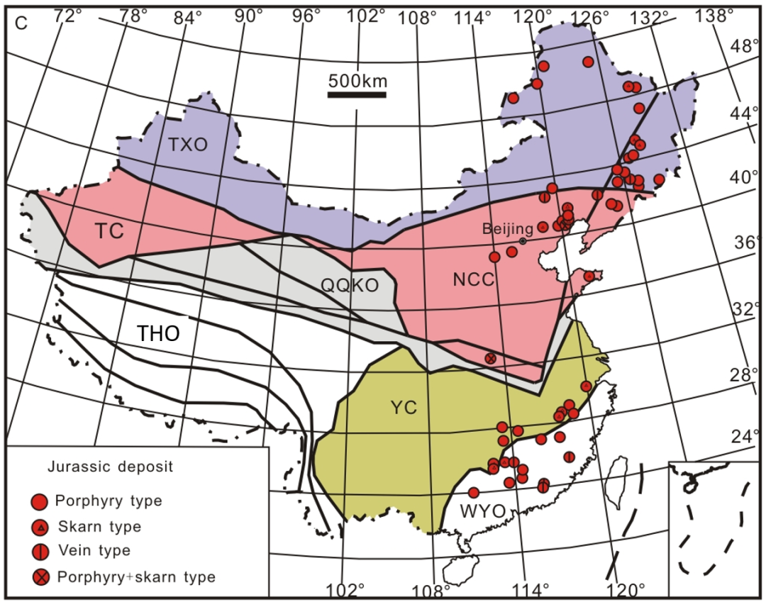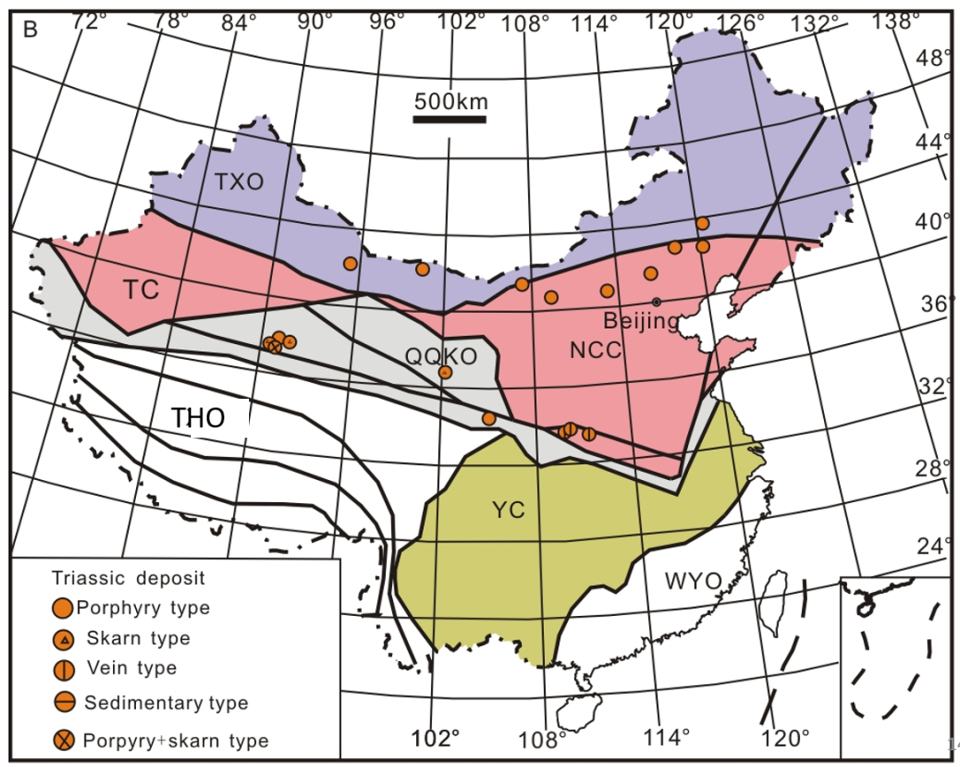 从图中可以看出,三叠纪的钼矿床大多分布于中国北方。