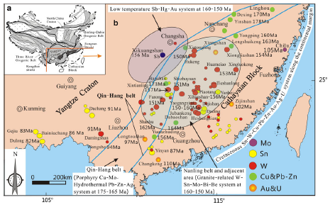 华南地区以钨锡矿种为特色,有少量的钼矿床,如园岭寨钼矿,主要形成于侏罗纪和早白垩世两个时期。