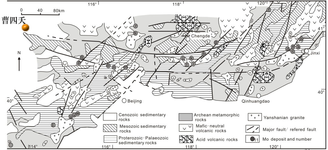 燕辽地区的钼矿以斑岩型和矽卡岩型为主,有三叠纪、侏罗纪、早白垩世三期成矿,比较出名的超大型钼矿为曹四夭钼矿。
